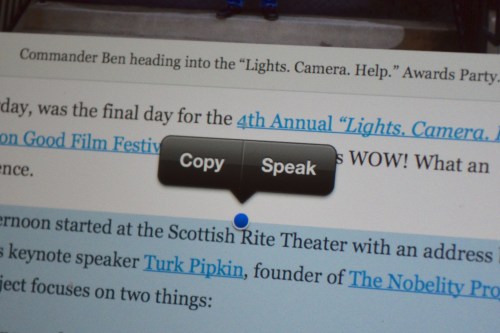 When you want to have your iPad speak to you, just highlight the text you want to read and when the screen instruction appears to “copy” or “speak” just tap on “speak”. That’s it!