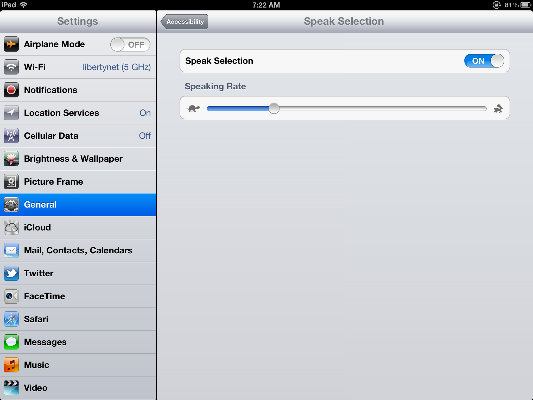 Tap on the “OFF” icon to turn Speak Selection “ON”. Next, adjust the “Speaking Rate” on the iPad screen.