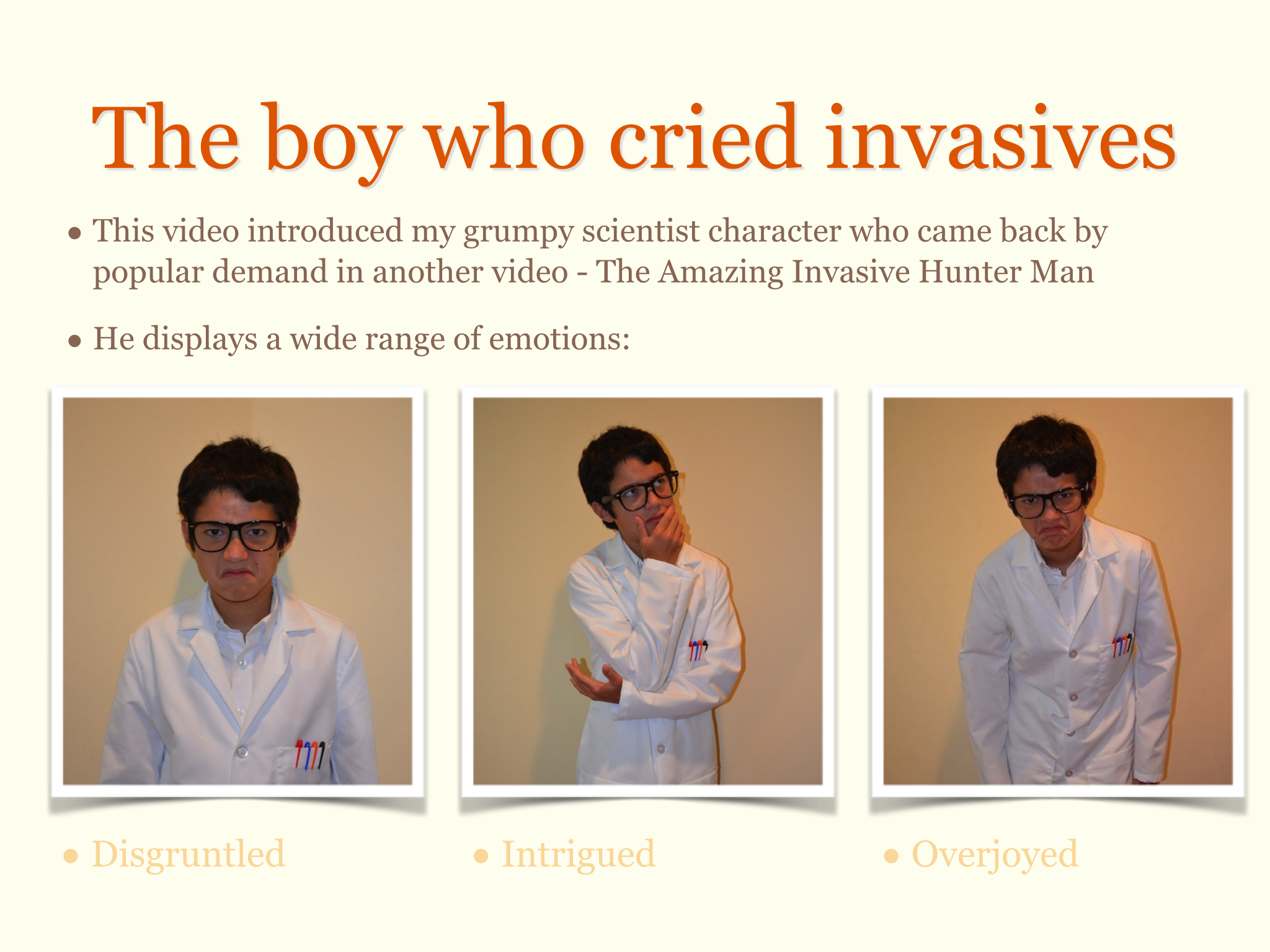 Adventures with Invasive Species presentation slide showing my grumpy scientist character’s wide range of emotions